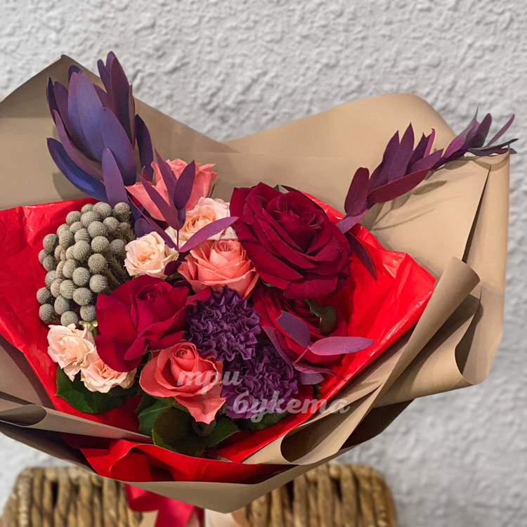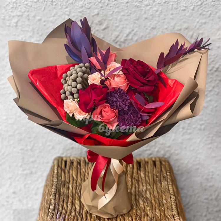 Букет из роз и фиолетовых гвоздик
