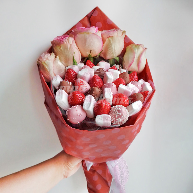 Букет из роз, клубники и маршмеллоу