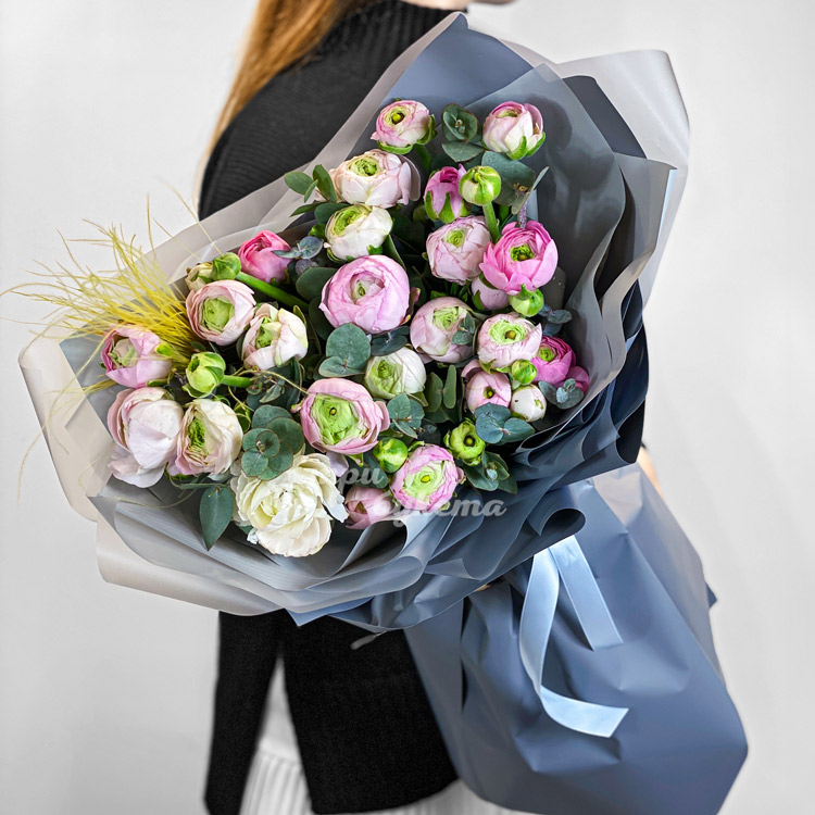 Букет розовых ранункулюсов с зеленью