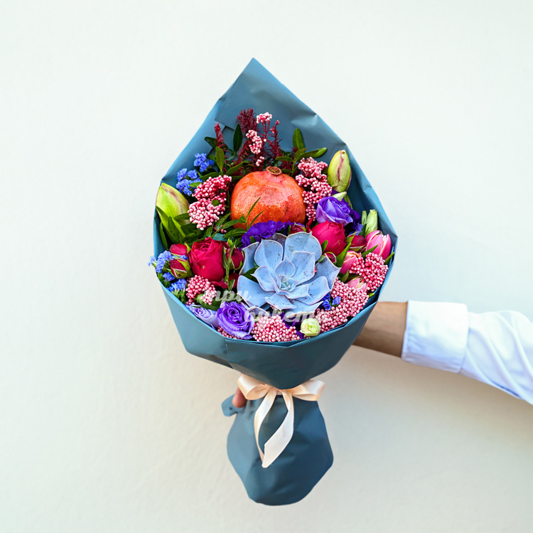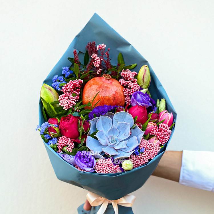 Букет с гранатом, суккулентом и зеленью