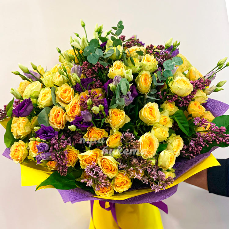 Букет желтых роз с эустомами и сиренью