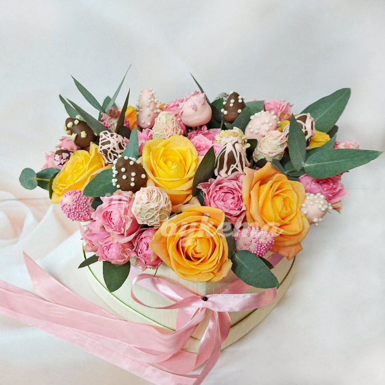 Композиция роз и клубники в шоколаде