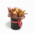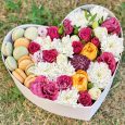 Нарциссы, фрезии и розы в коробке