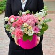 Розовая роза и гвоздики в коробке