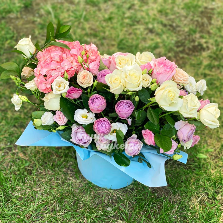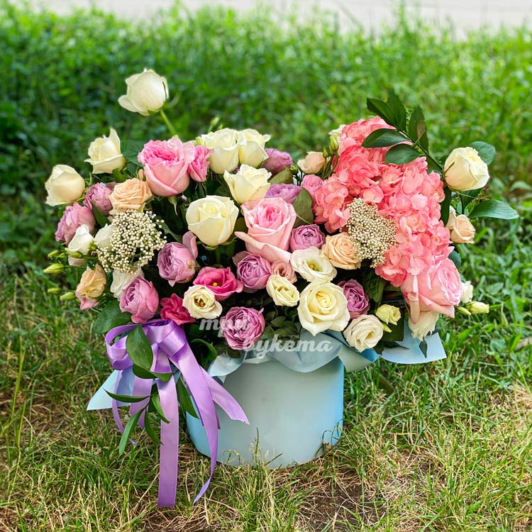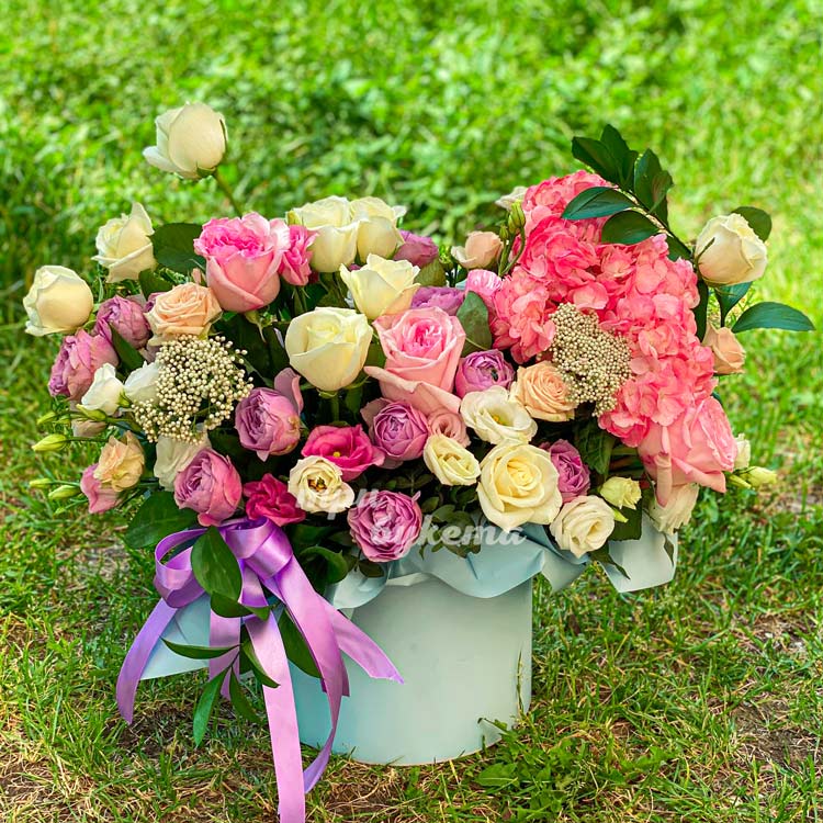 Шляпная коробка роз, эустом и гортензии